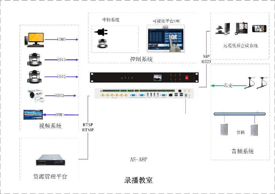 项目包含:本项目共建设1个录播教室,使用1台视通科技(AVSYS)多媒体综合管理一体机,实现统一控制管理,音视频调度,会议室互动等应用。